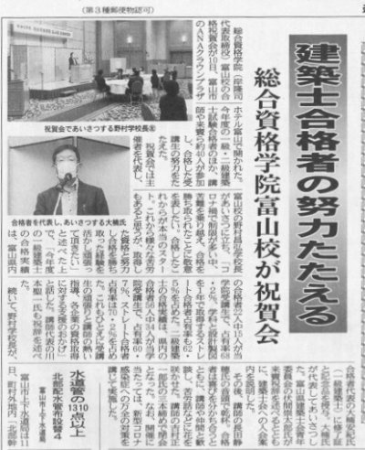 一級建築士合格祝賀会での挨拶 2022.01.12 建設工業新聞 私が通っていた資格学校の合格祝賀会が開催され、合格者代表で挨拶した記事が建設工業新聞に載りました。 今回の合格でかなり舞い上がっていまして、なにを話したか記憶に無いのですが、このように取り上げて頂き嬉しさもひとしおです。 挨拶の中で言ったともいますが、資格所得はスタートラインに立つことができたことですので、これからこの資格に恥じないような仕事をしたいと思います。