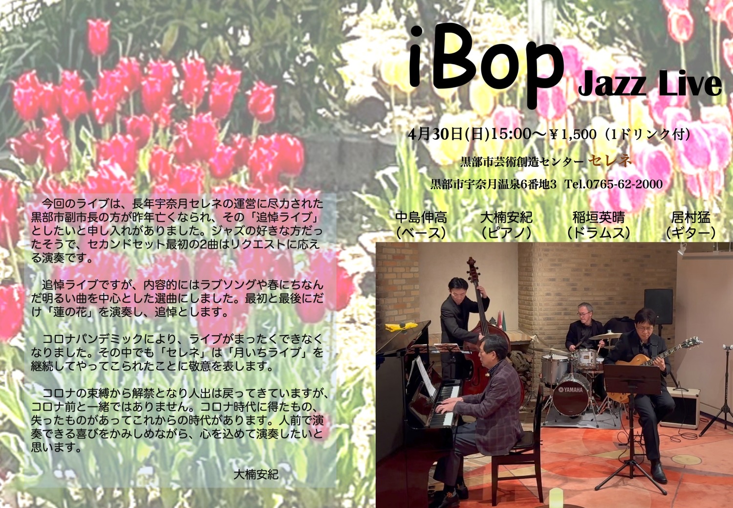 今回のライブは、長年宇奈月セレネの運営に尽力された黒部市副市長の方が昨年亡くなられ、その「追悼ライブ」でした。