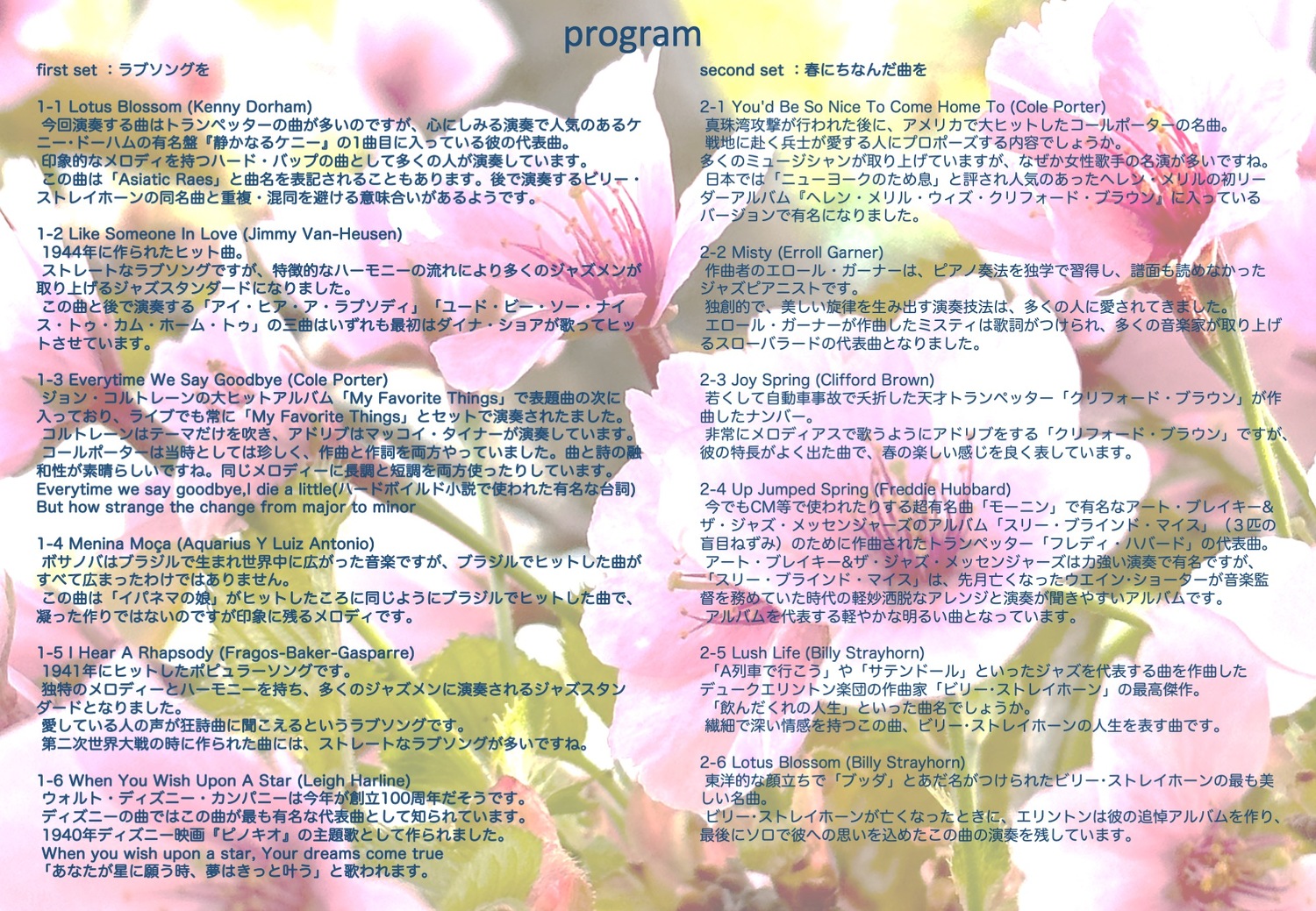 追悼ライブですが、内容的にはラブソングや春にちなんだ明るい曲を中心とした選曲にしました。