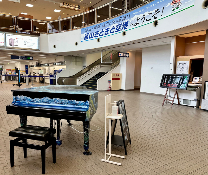 富山空港1階国内線到着ロビー内にあり、この場所は吹抜けになっておりピアノの音が2階国内線出発ロビーに響き渡ります。