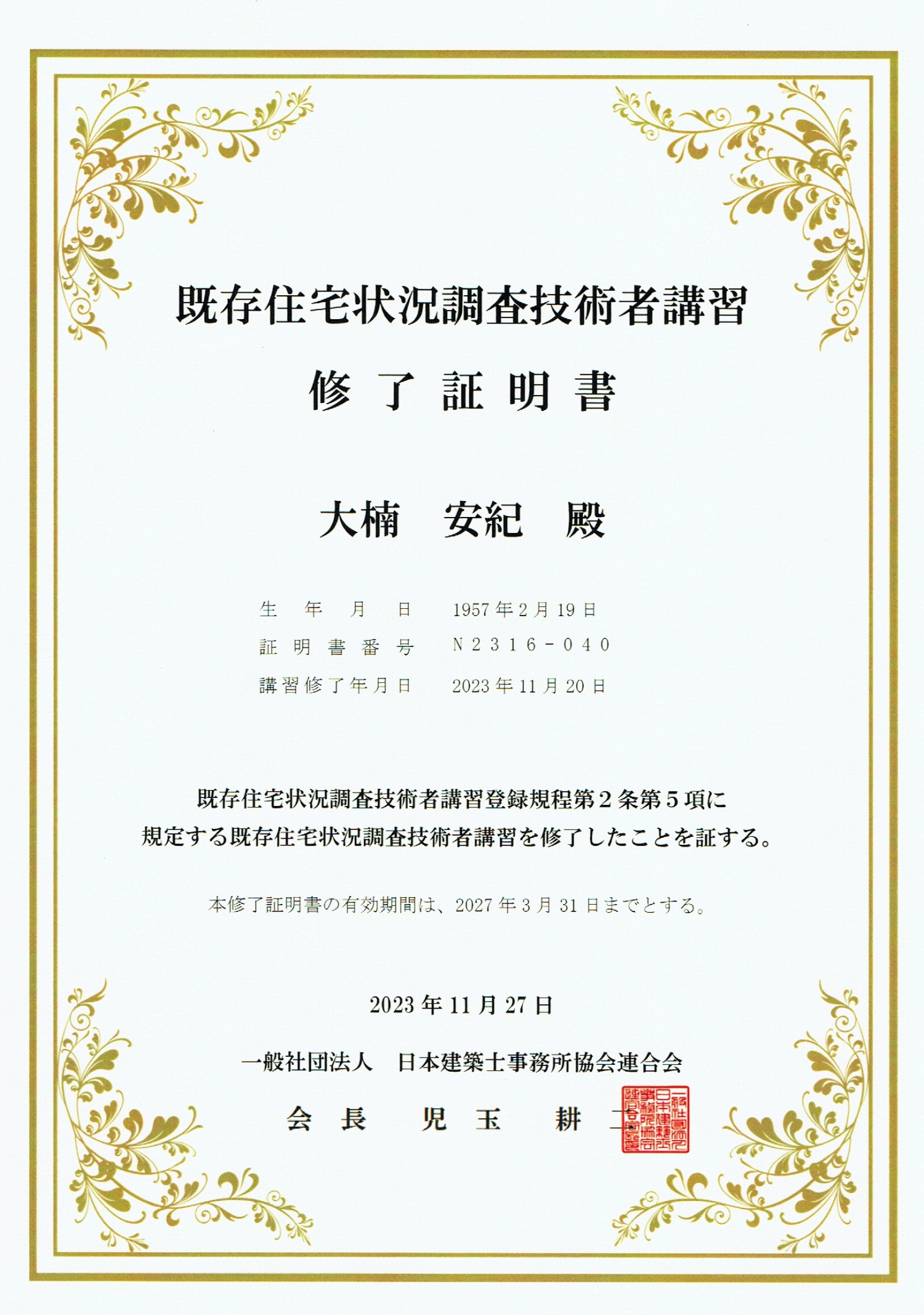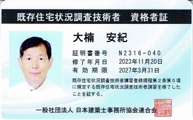 既存住宅状況調査技術者 資格証 2023.11.30 新しい既存住宅状況調査技術者 資格証が届きました。 証明書番号:N2316-040 有効期間:2027年3月31日 住宅リフォーム推進協議会の既存住宅状況調査技術者検索に一級建築士で登録されています。 住宅リフォーム推進協議会
