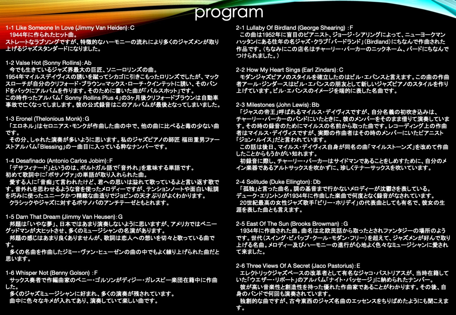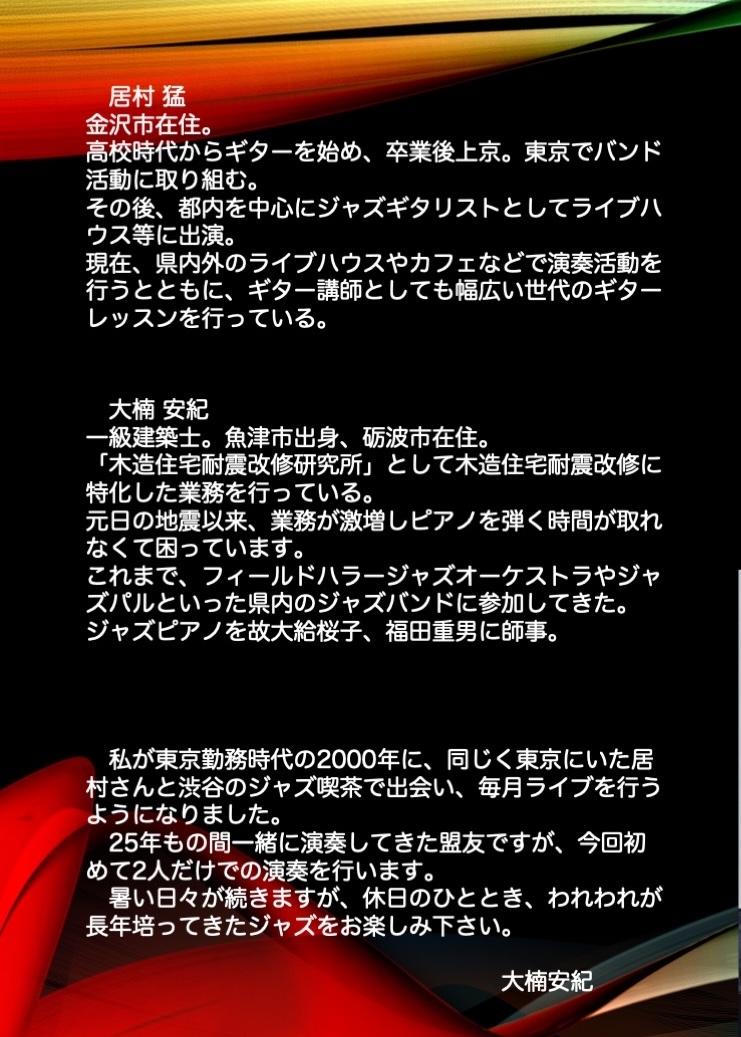 居村猛(Guitar)&大楠安紀(Piano) DUO Live 2024.08.27 2000年に東京で出会い、25年間一緒に演奏活動を行っている朋友 居村猛(ギター)と初めてDUOでジャズライブを行いました。 場所:黒部市芸術創造センター セレネ 黒部市宇奈月温泉6番地3 (Tel.0765-62-2000) 日時:8月25日(日)15:00〜