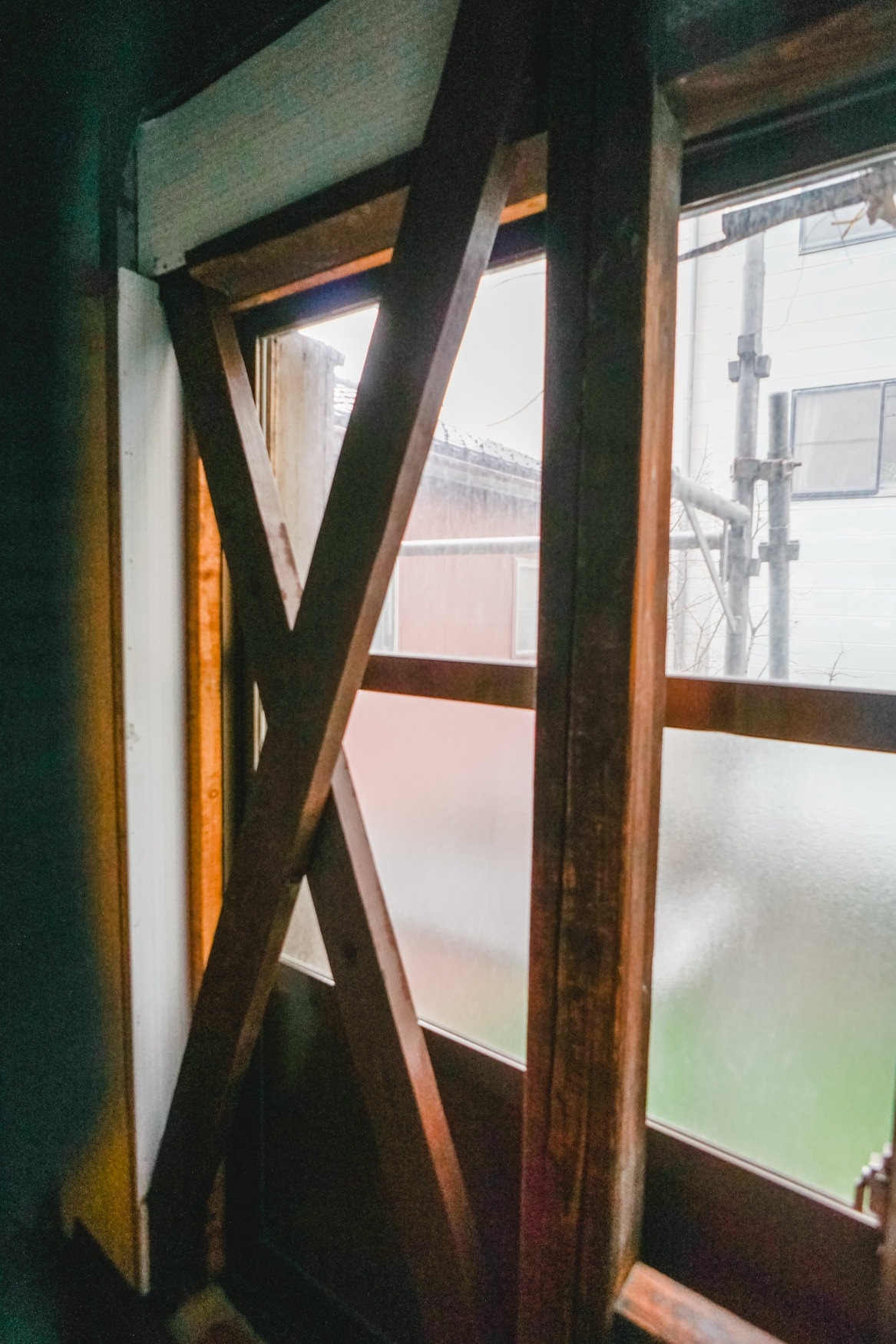 建物の東面はすべて開口部であり、この面の耐力を得るために玄関横の勝手口引き違い戸を撤去し、勝手口ドアと耐力壁を設置しました。2階で開口部を潰さずに耐力を増すため開口部を残し筋交いのみを設置する箇所を作りました。