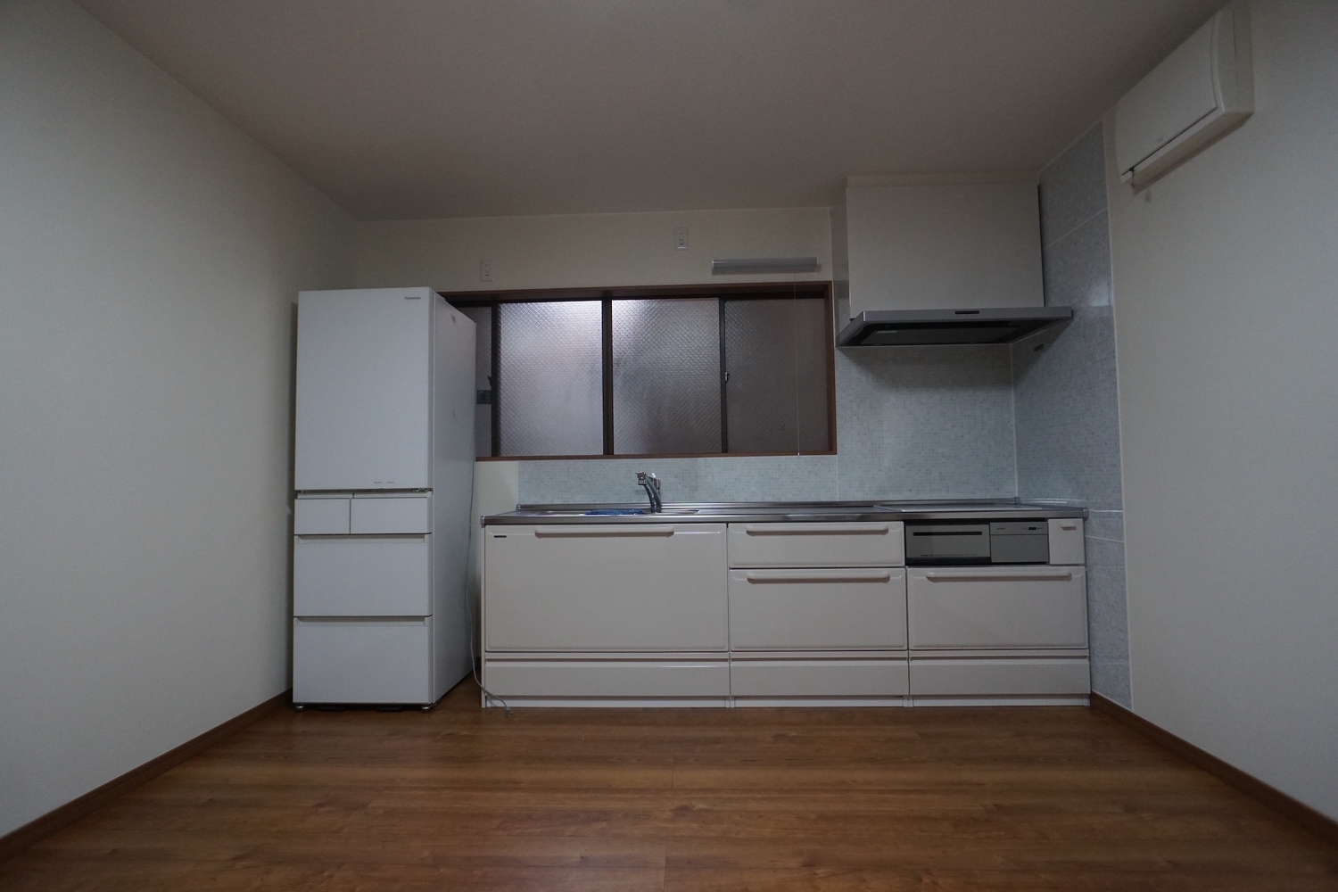ダイニングキッチンには勝手口がありましたが、勝手口の撤去を行い耐力壁とし、システムキッチンのIHコンロ部及びレンジフードを設置することにより、冷蔵庫の移動を含めたキッチンの使いやすさが実現できました。