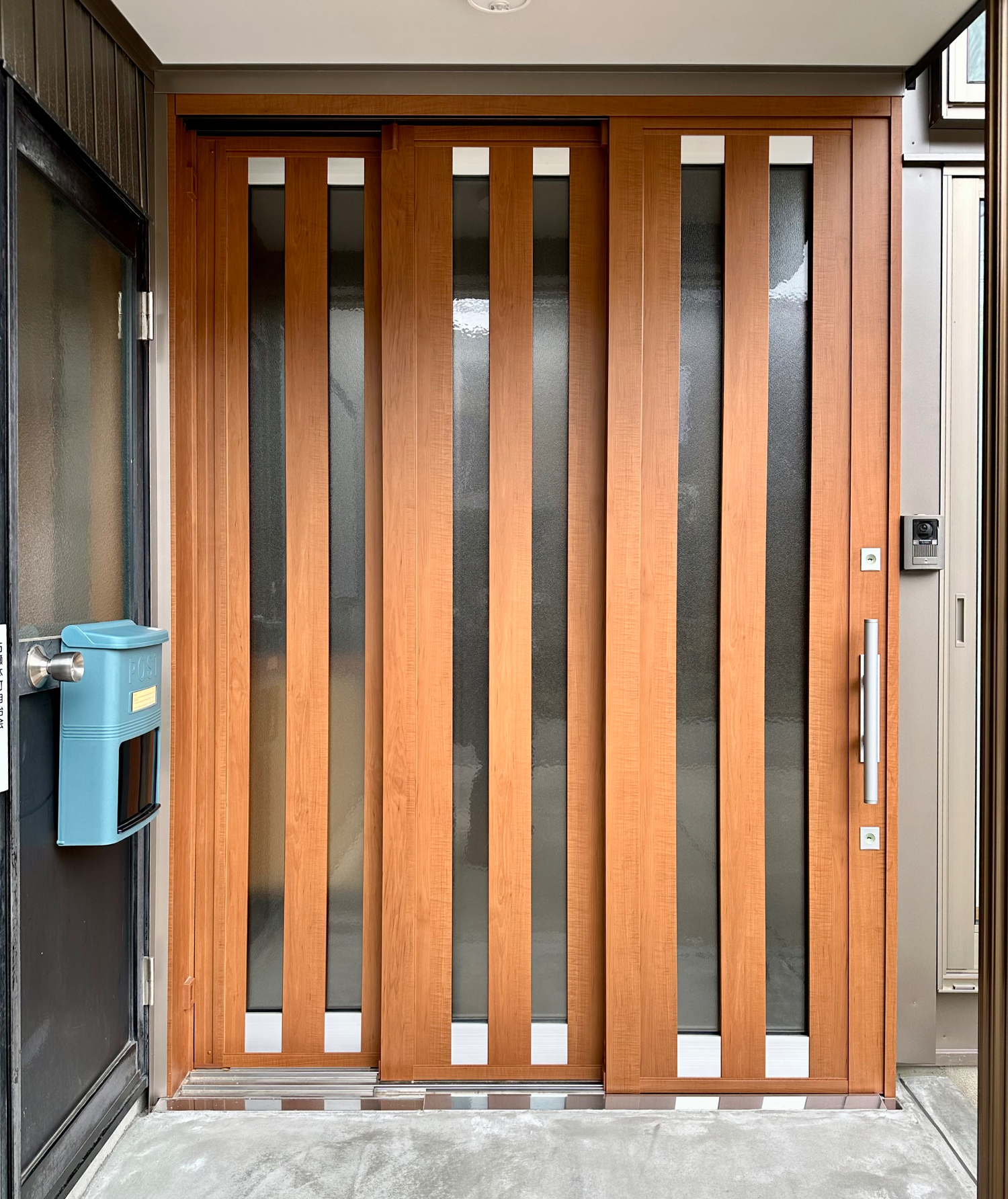 (3)玄関ドアを袖付き2枚連動引戸へ交換し、有効開口を広げた。