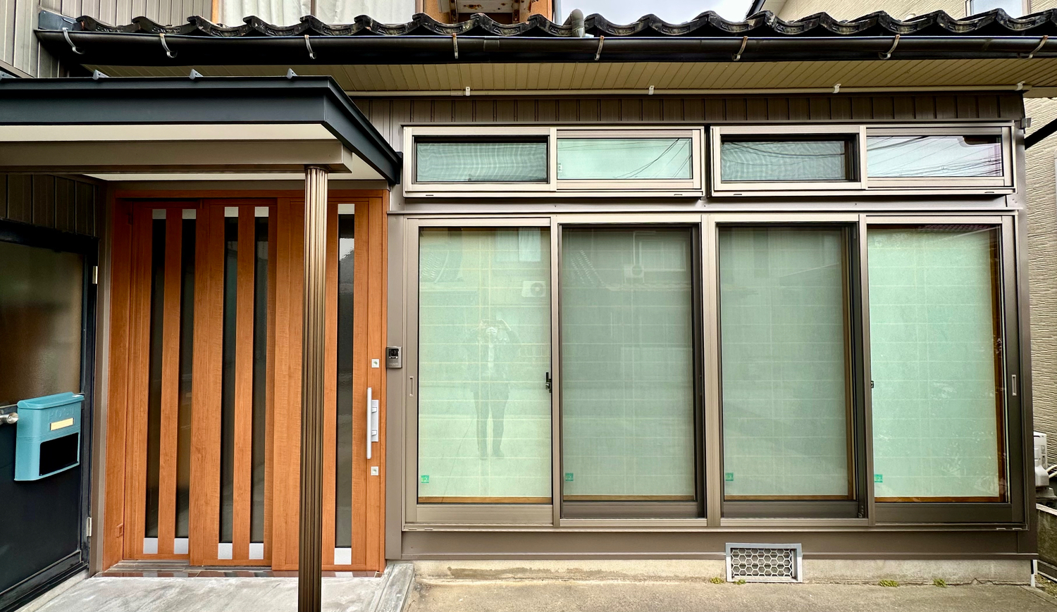 道路に面した4枚戸を樹脂複合断熱サッシへ取替。ガラスは防犯性・断熱性を考慮し、防犯Low-Eペアガラスへ変更。