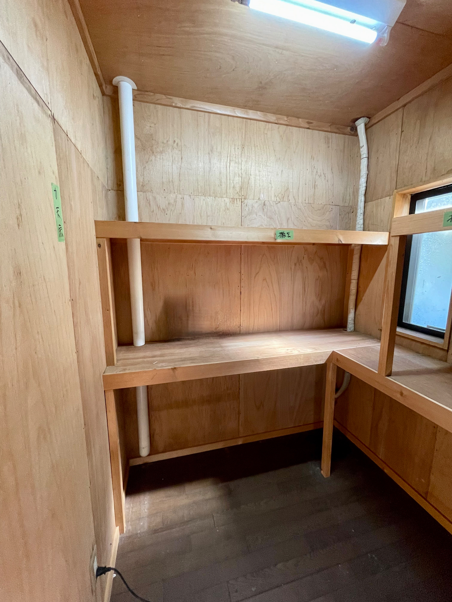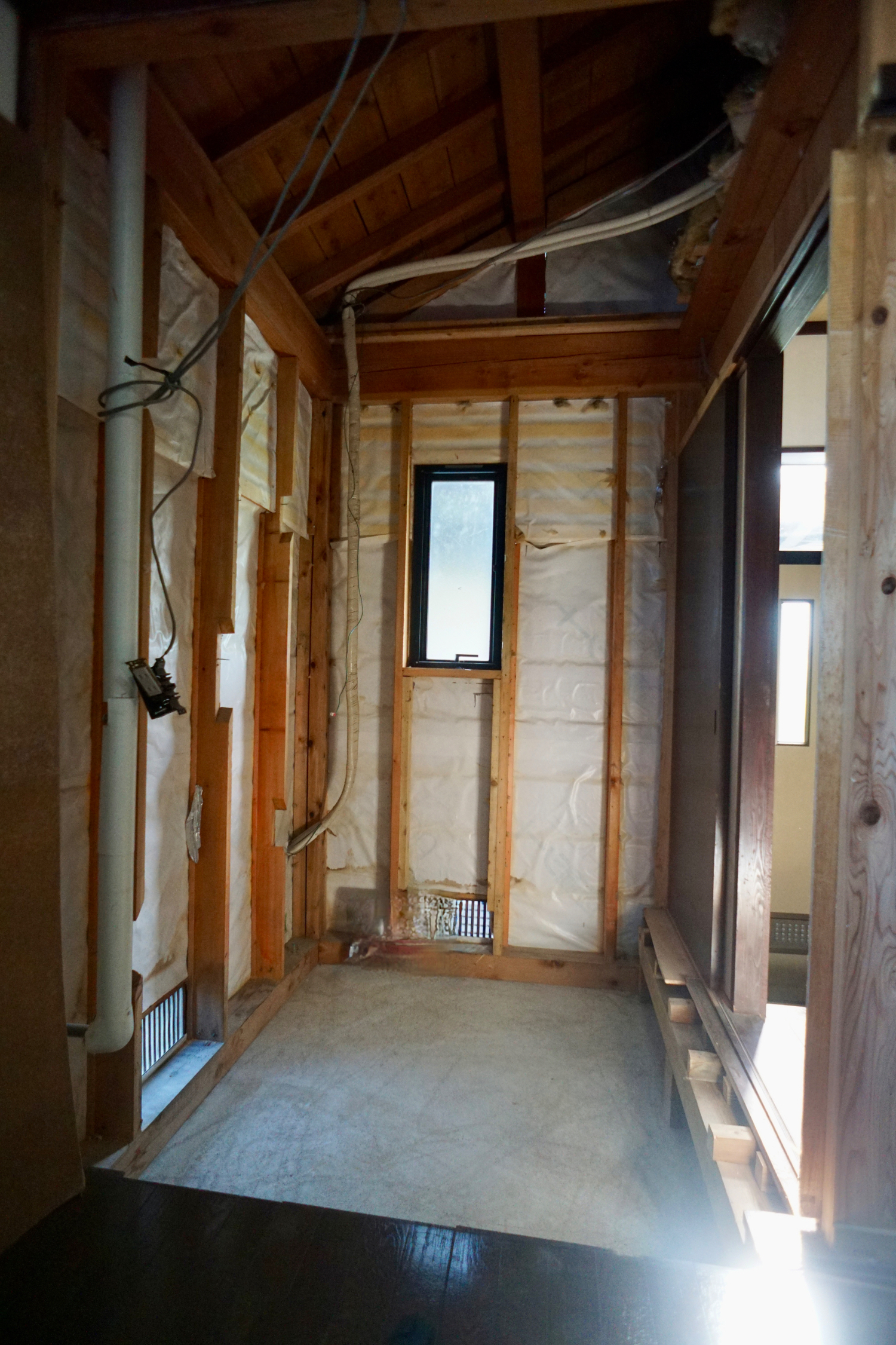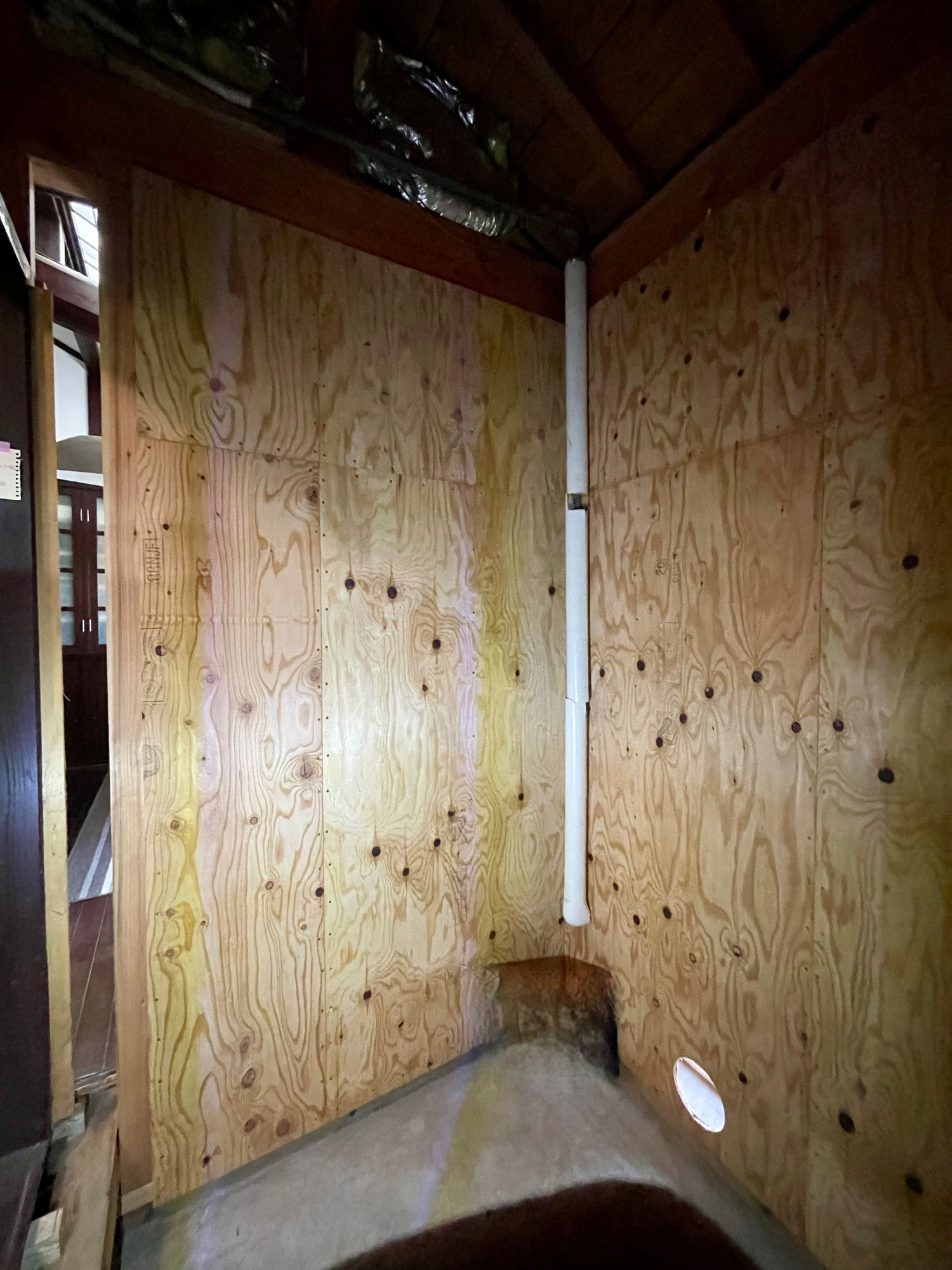 2階において、梁に出入り等があり、従来壁の内部に新規耐力壁を設置。