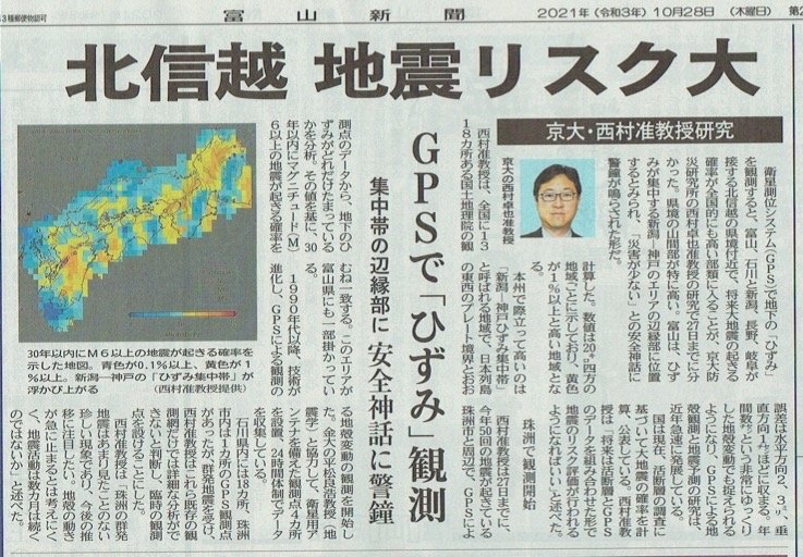 2021年10月28日付けの富山新聞一面に、北信越の地震リスクが大きいと記事が載りました。