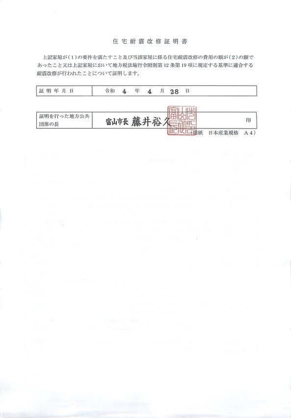 尚、当コラム最初に載せた行政からの「住宅耐震改修証明書」を取得することも可能です。当事務所で申請業務を行っています。