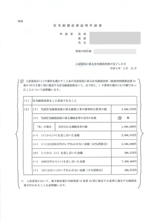 2月に住宅耐震改修を完了した物件について減税手続きを行いました。