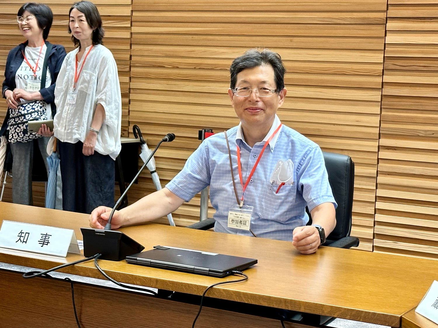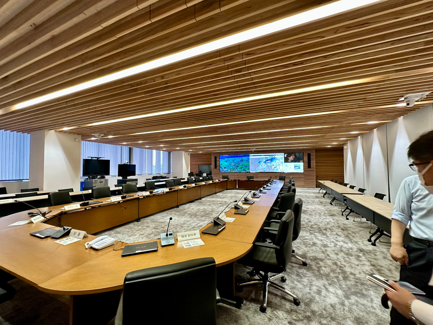 災害対策本部員会議室では、知事席に座ることができ、もう一生こんな席に座ることはないだろうと写真を撮って頂きました。