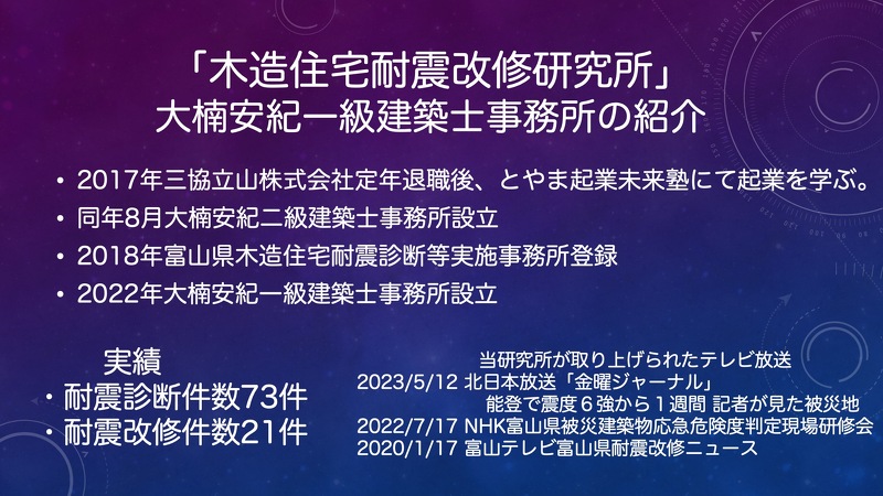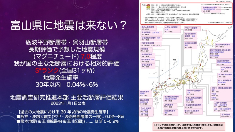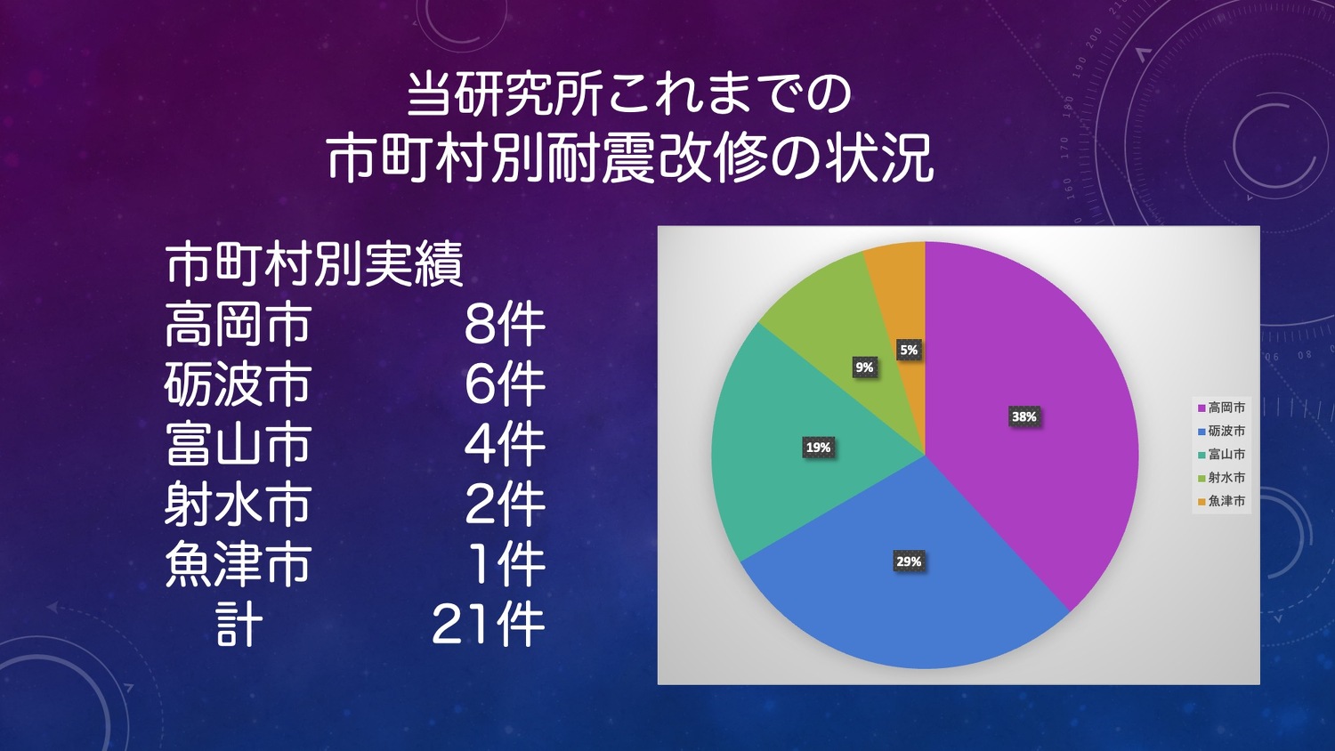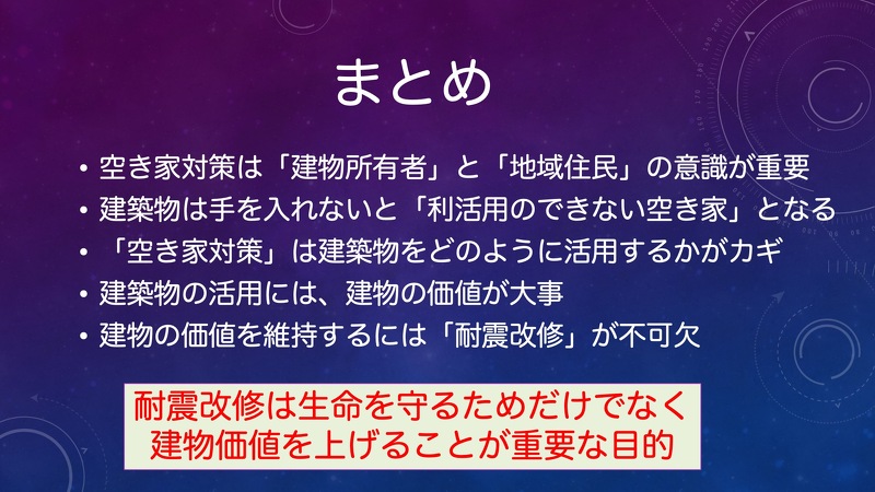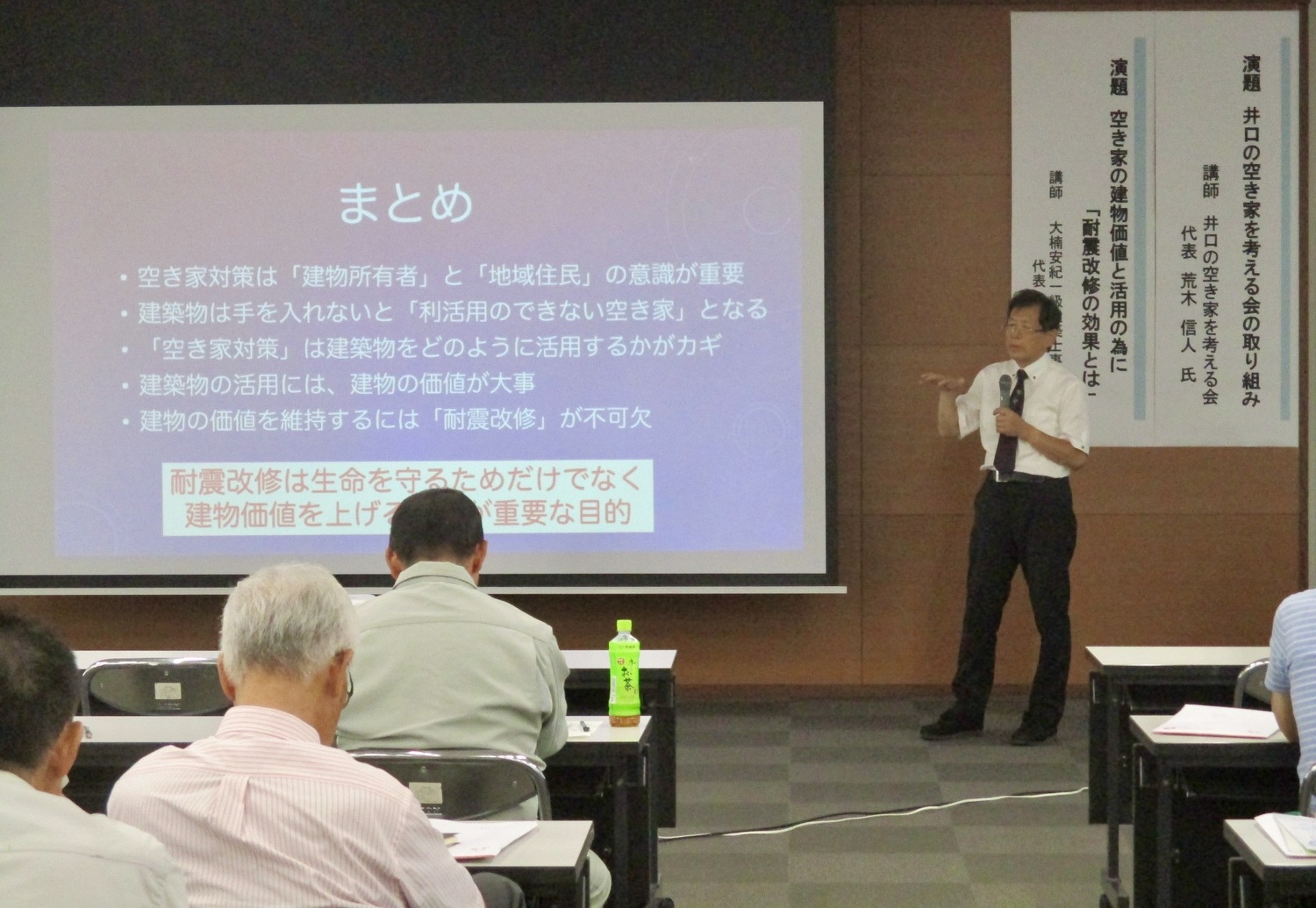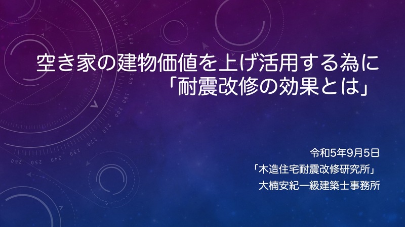 南砺市空き家等地域対策推進員研修会講演:空き家の建物価値を上げ活用するために「耐震改修の効果とは」 2023.10.01 9月5日(火)に、南砺市の空き家等地域対策推進員研修会で講師をさせて頂きました。 ”空き家の建物価値を上げ活用するために「耐震改修の効果とは」” と題し、耐震改修と空き家対策について話をさせて頂きました。 発表スライド
