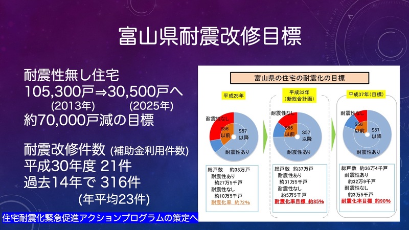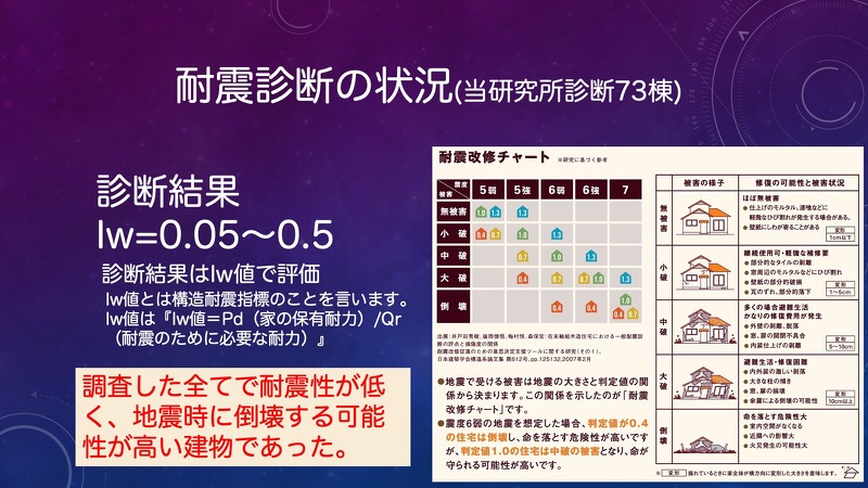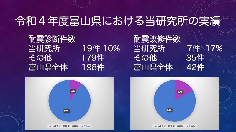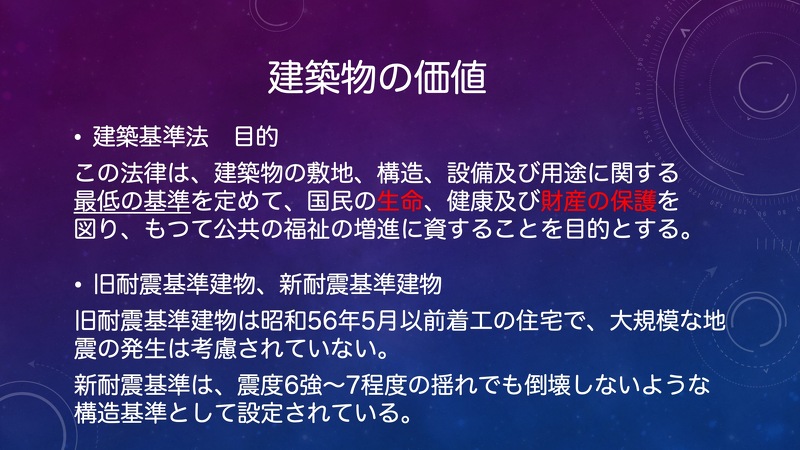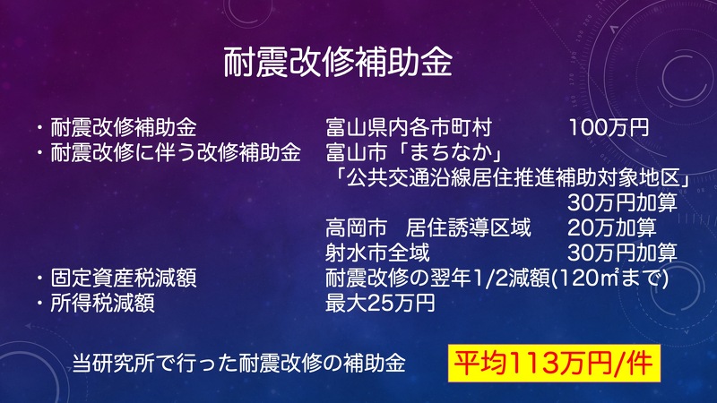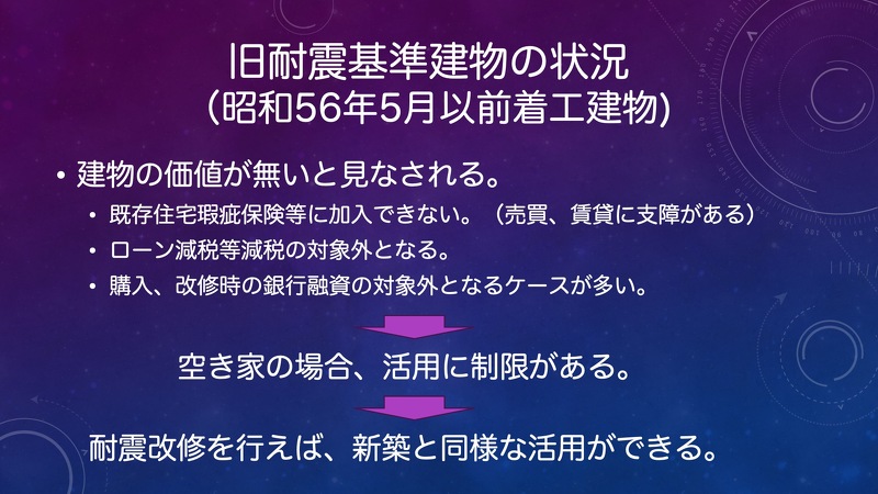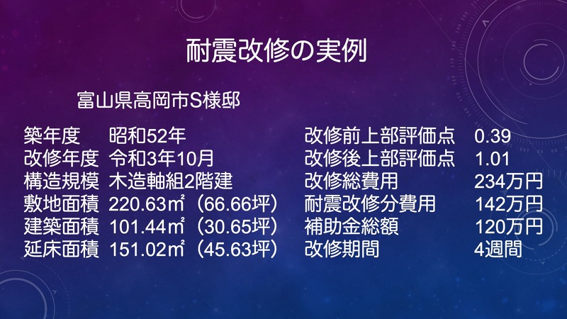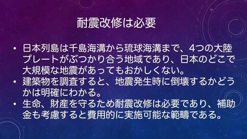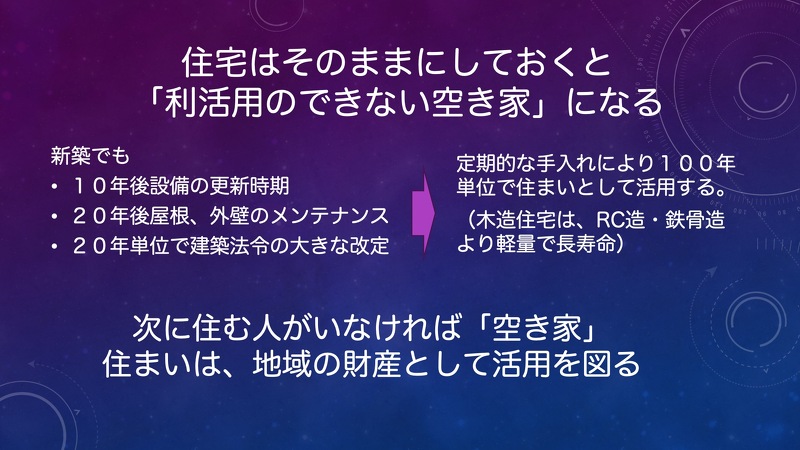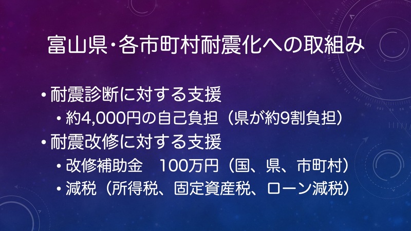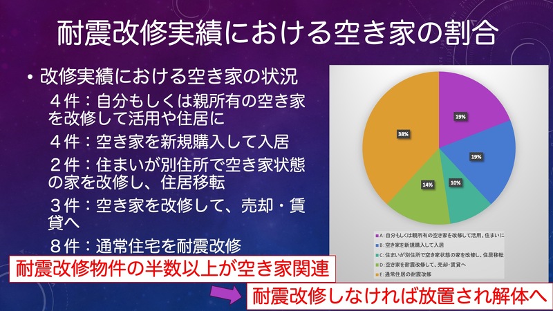 南砺市空き家等地域対策推進員研修会講演:空き家の建物価値を上げ活用するために「耐震改修の効果とは」 2023.10.01 9月5日(火)に、南砺市の空き家等地域対策推進員研修会で講師をさせて頂きました。 ”空き家の建物価値を上げ活用するために「耐震改修の効果とは」” と題し、耐震改修と空き家対策について話をさせて頂きました。 発表スライド