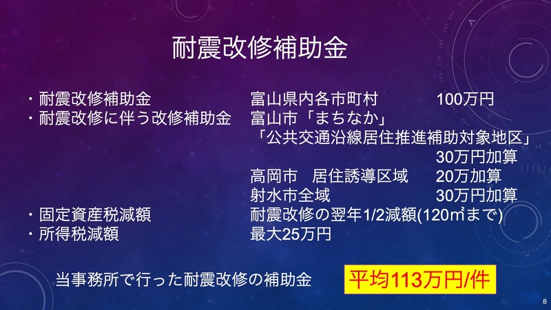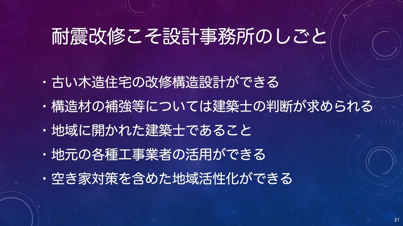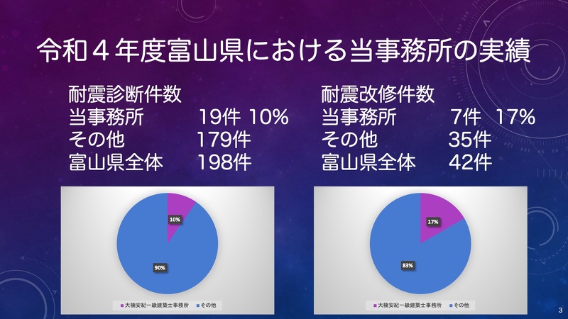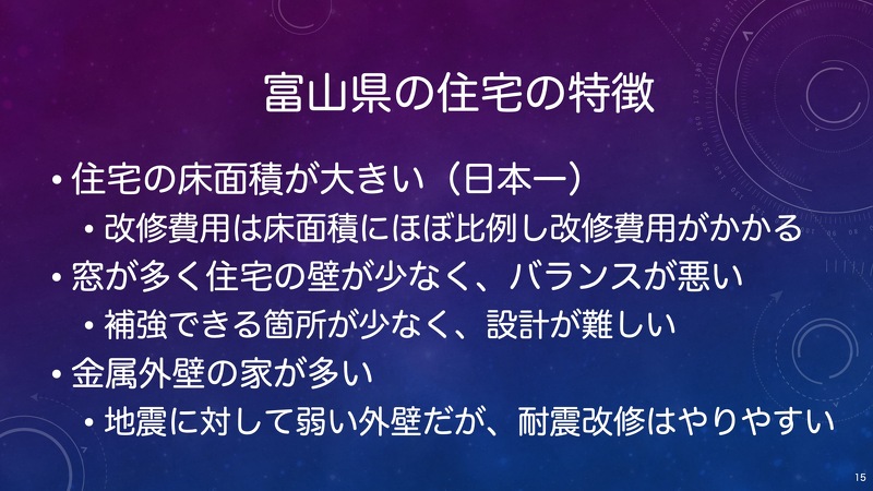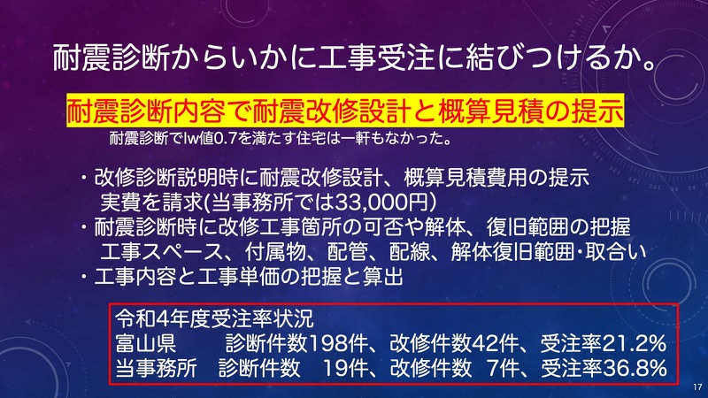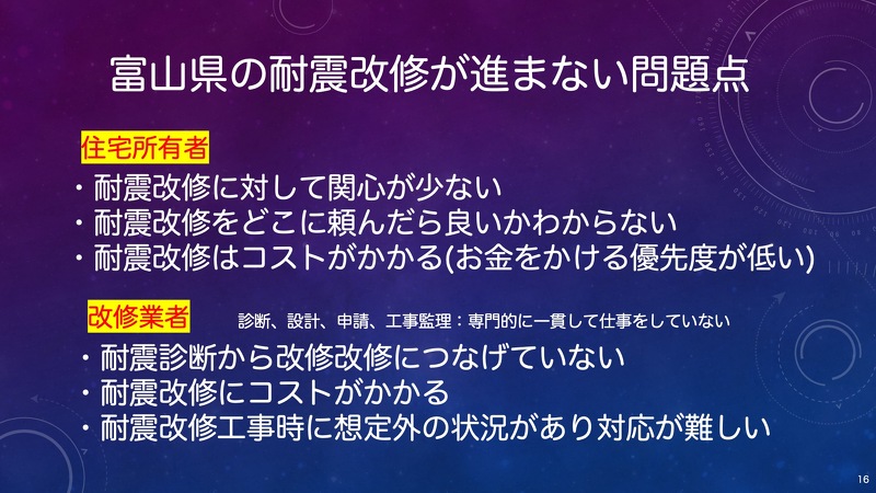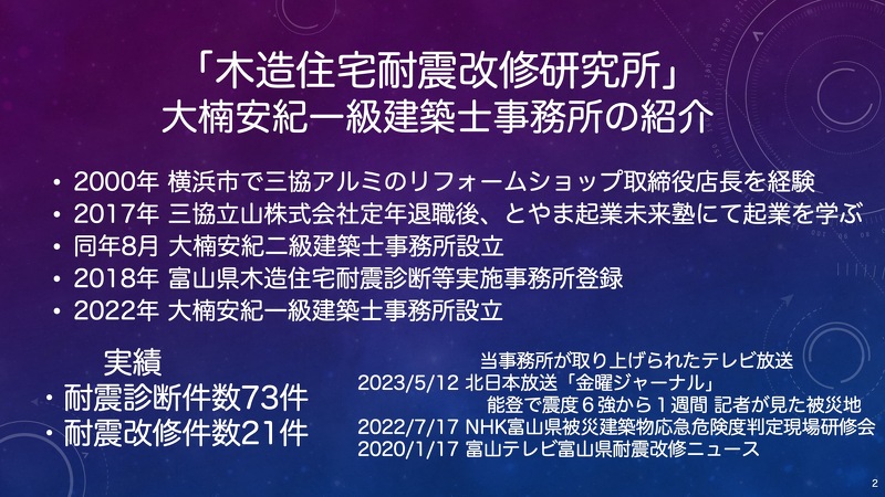 富山県建築士事務所協会高岡支部講習会「建築士事務所が木造住宅耐震改修を進めるには」 2023.10.28 富山県建築士事務所協会高岡支部では、ZOOMを使った会議を持っていますが、ここで耐震改修の講習会を行いました。 題目は「建築士事務所が木造住宅耐震改修を進めるには」です。 単に、木造住宅耐震改修を行うことだけでなく、建築士事務所が抱える問題点が今回の質疑の中で見えるような気がしました。