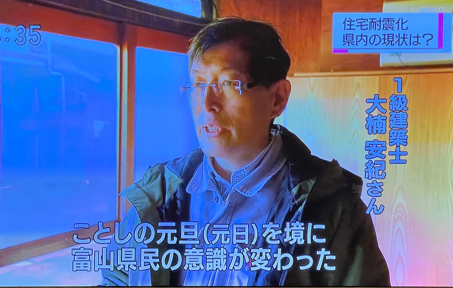 NHKニュース富山人で放送されました。1月26日 2024.01.28 1月26日(金)のNHKニュース富山人に耐震診断をしている内容が放送されました。 富山県では、例年200件程度の耐震改修依頼件数ですが元日の地震以来300件を超える耐震改修要望が来ているそうです。 私の所にも耐震診断や改修の相談が激増し、昨年一年分の依頼が一週間できていて、てんてこ舞いの状況です。 今までと異なるのは、補助金の出ない昭和56年以降の新耐震物件の改修相談も来ています。 これまで富山県で旧耐震住宅の耐震改修に真剣に取り組んできたところがなかったなと感じる日々です。