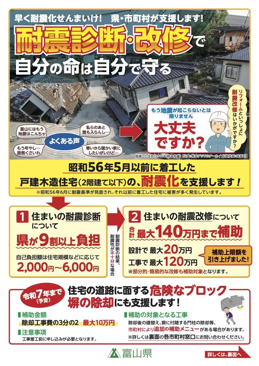令和7年度富山県木造住宅の耐震診断・耐震改修の支援制度が始まりました。
