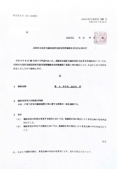 高岡新市長名で令和3年度最初の木造住宅耐震改修補助金交付決定通知書をいただきました。 2021.07.13 令和3年度最初の木造住宅耐震改修の補助金交付が決定しました。 今回は高岡市の物件で、新市長名での通知書でした。 新市長には、色々な課題がたくさんあって大変だとは思いますが、若さで高岡市を変革していってほしいと思います。 色々な決定がスピード感を持って進められていくように感じました。