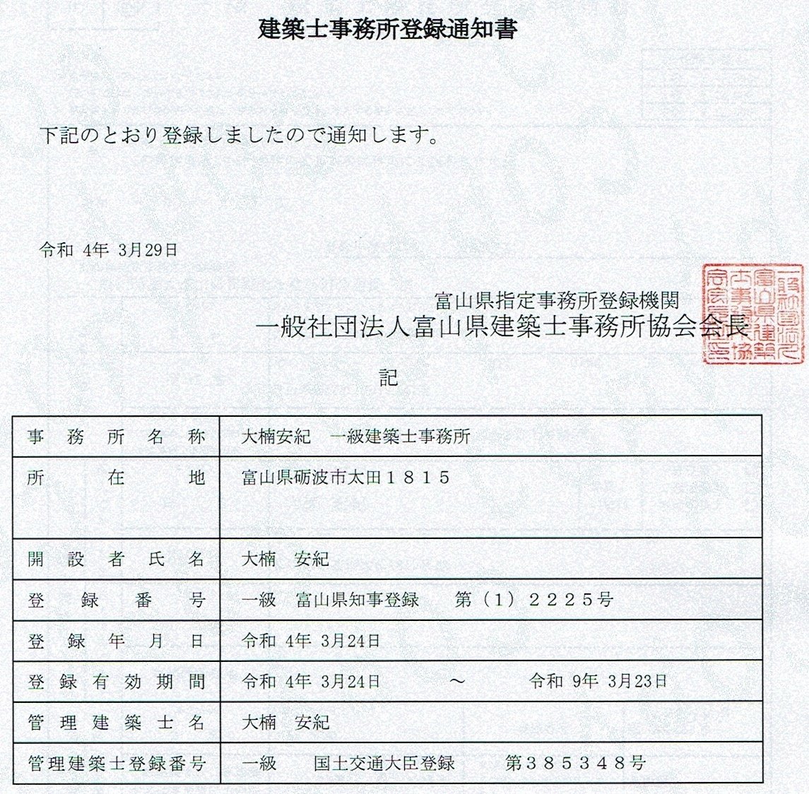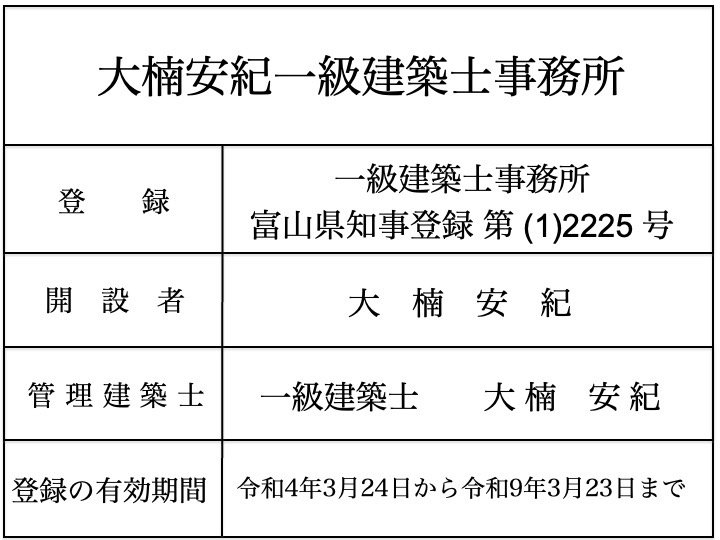 一級建築士事務所になりました。 2022.03.30 一級建築士事務所登録がされました。 事務所名:大楠安紀一級建築士事務所 登録番号:一級 富山県知事登録 第(1)2225号 登録年月日:令和4年3月24日 これで、すべての建築物に関し、設計、工事監理その他の業務をできるようになりました。 事務所前の看板も新しい物に変更しました。 これまで、色々と支援して頂いた方々に感謝です。 この事務所に恥じないように業務に当たります。