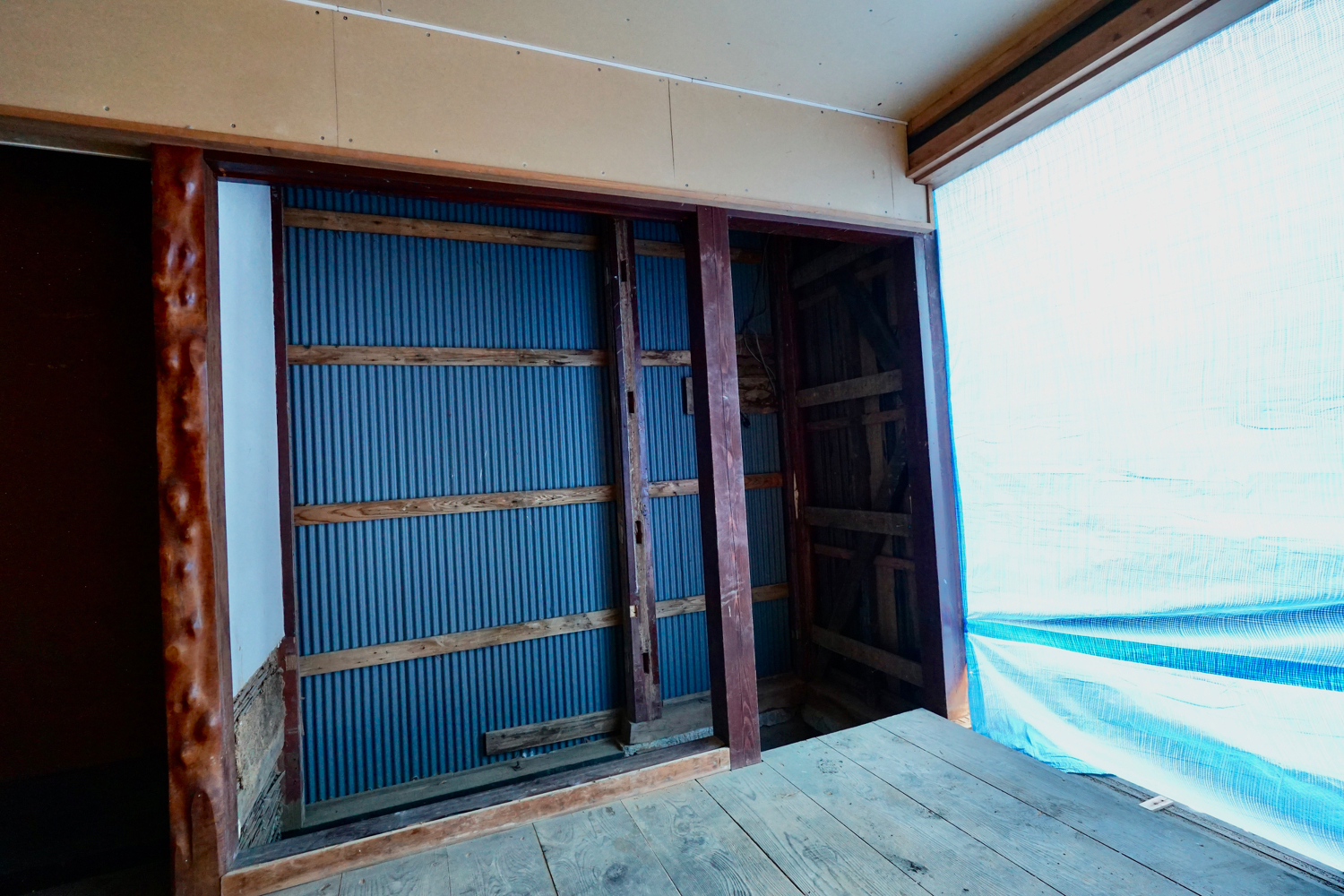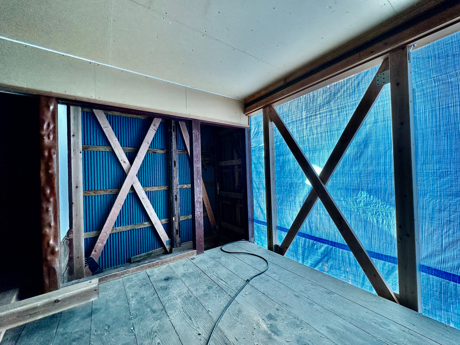 外壁はトタン一枚で耐力無し、柱は土台の上に乗っかっているだけです。