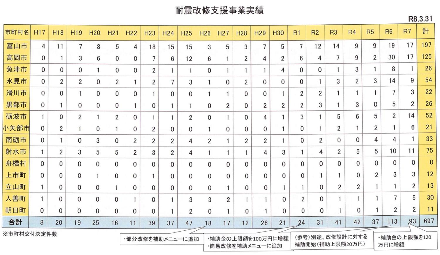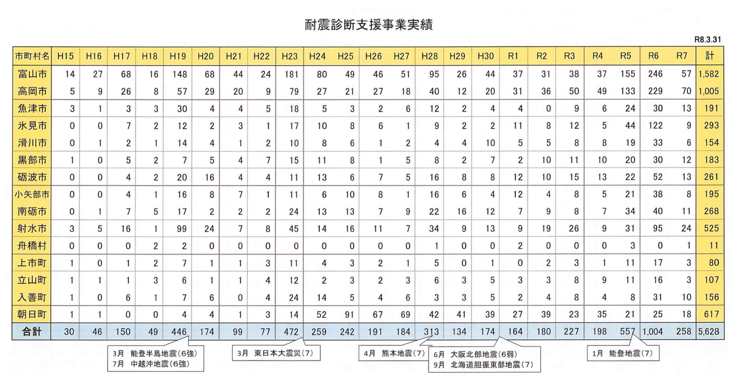 令和7年度富山県耐震診断・改修件数(補助金取得分) 2026.04.19 令和7年度の補助金を利用した耐震診断及び耐震改修の件数が公表されました。 令和8年度件数 富山県 弊社研究所 耐震診断 258 15 耐震改修 93 23 耐震改修当社比率25% 弊社研究所は、富山県耐震改修件数の1/4を行っていることがわかるかと思います。